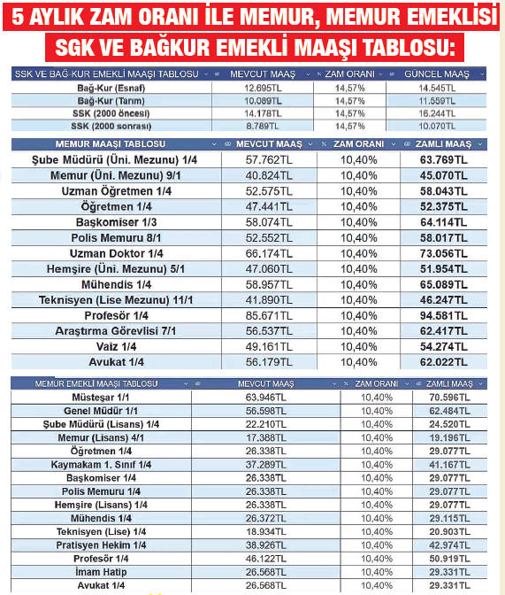 Memur ve emeklilerin yeni yılda geçerli olacak maaş zammı netleşmeye başladı. Kasım ayı enflasyonunun açıklanmasıyla yılın ikinci yarısında 5 aydaki enflasyon yüzde 14,6 olarak gerçekleşti. SSK ve Bağ-Kur emeklileri enflasyon oranında zam alırken, memur ve memur emeklileri toplu sözleşme zammına ek olarak enflasyon farkı alıyor. Milyonlarca memur ve emekli ocak ayında zam oranının ne olacağını merak ediyor. Yılın ikinci yarısına ilişkin enflasyon verilerinin ardından zam oranları büyük oranda netleşti. Türkiye İstatistik Kurumu (TÜİK) verilerine göre temmuz, ağustos, eylül, ekim ve kasım aylarını kapsayan 5 ayda enflasyon yüzde 14,6 oldu. Buna göre, aylık enflasyon temmuz ayı için yüzde 3,32 ağustos ayı için 2,47, eylül ayı için 2,97, ekim ayı için 2,88 ve kasım ayı için de yüzde 2,24 olarak gerçekleşti.