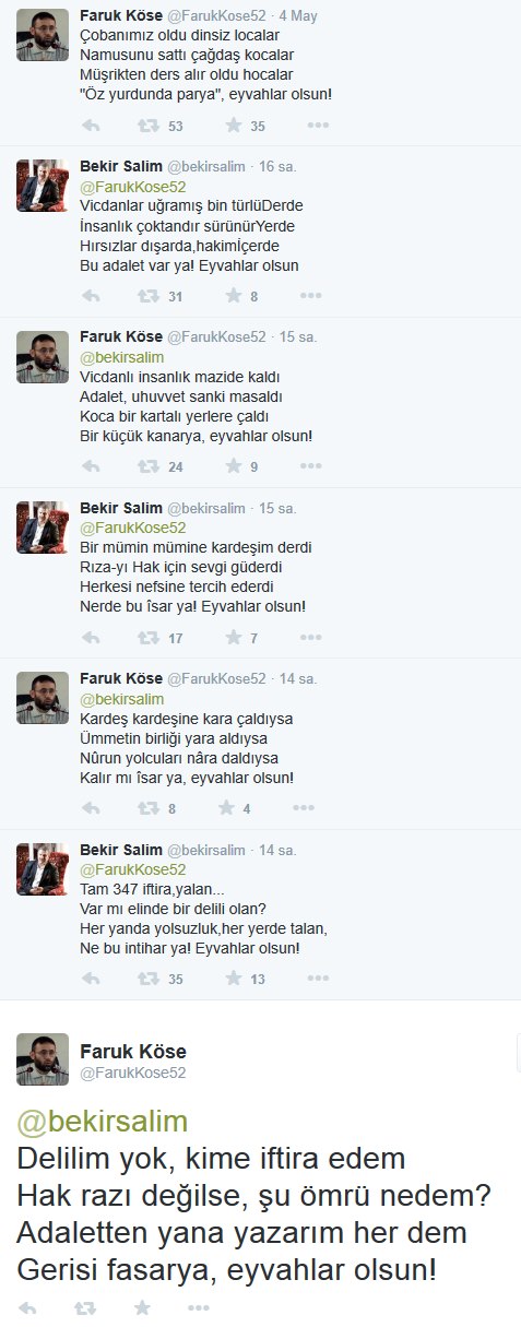 Gazetemiz yazarı Faruk Köse'nin Twitter'da paylaştığı dörtlüğe Zaman gazetesi yazarı Bekir Salim cevap vermeye kalkınca kapak üstüne kapak yedi.