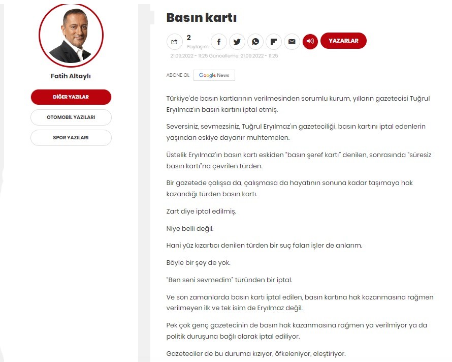 Türkiye’de basın kartlarının verilmesinden sorumlu kurum, yılların gazetecisi Tuğrul Eryılmaz’ın basın kartını iptal etmiş.