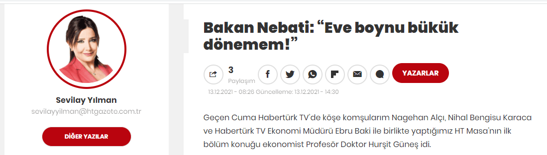 Habertürk yazarlarından Sevilay Yılman, Hazine ve Maliye Bakanı Nureddin Nebati ile bir telefon görüşmesi gerçekleştirdi. Yılman, Bakan Nebati ile yaptığı görüşmenin detaylarını röportaj haline getirerek köşesine taşıdı.