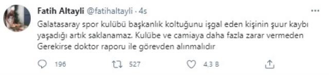 Daha sonra bir paylaşım daha yapan Altaylı, "Galatasaray spor kulübü başkanlık koltuğunu işgal eden kişinin şuur kaybı yaşadığı artık saklanamaz. Kulübe ve camiaya daha fazla zarar vermeden gerekirse doktor raporu ile görevden alınmalıdır" ifadelerini kullandı.