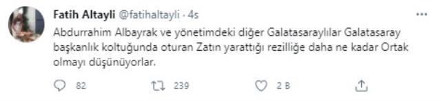 Sosyal medya hesabından Abdurrahim Albayrak ve yönetimdeki diğer isimlere çağrıda bulunan Altaylı, "Abdurrahim Albayrak ve yönetimdeki diğer Galatasaraylılar, Galatasaray başkanlık koltuğunda oturan zatın yarattığı rezilliğe daha ne kadar ortak olmayı düşünüyorlar" dedi.