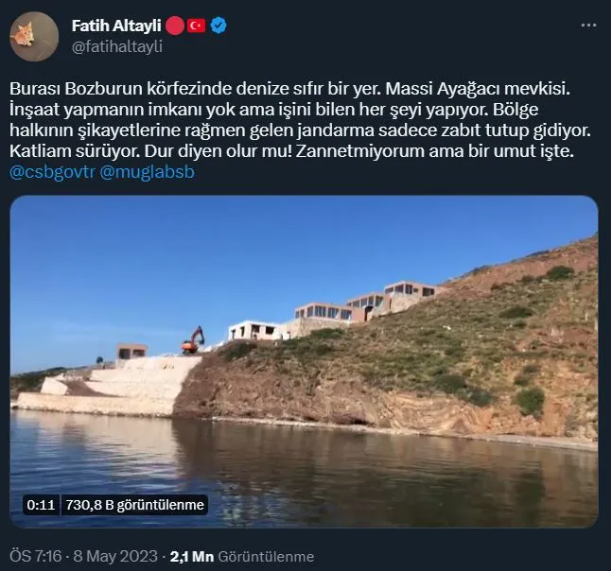 Habertürk Yazarı Fatih Altaylı sosyal medya hesabından 08.05.2023 tarihinde “Burası Bozburun körfezinde denize sıfır bir yer. Massi Ayağacı mevkisi. İnşaat yapmanın imkanı yok ama işini bilen her şeyi yapıyor. Bölge halkının şikayetlerine rağmen gelen jandarma sadece zabıt tutup gidiyor. Katliam sürüyor. Dur diyen olur mu! Zannetmiyorum ama bir umut işte. “ diye bölgeden görüntünün de yer aldığı bir paylaşım yaptı.