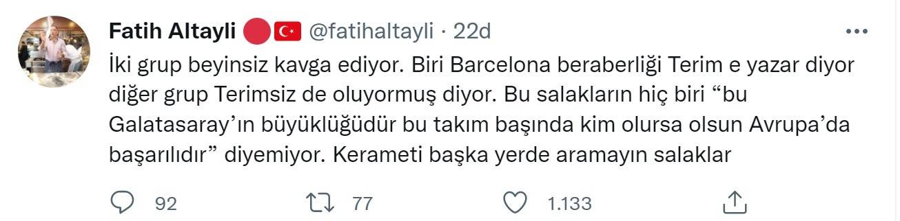 Twitter hesabından galatasaray taraftarına yönelik paylaşım yapan Altaylı, "İki grup beyinsiz kavga ediyor. Biri Barcelona beraberliği Terim e yazar diyor diğer grup Terimsiz de oluyormuş diyor. Bu salakların hiç biri “bu Galatasaray’ın büyüklüğüdür bu takım başında kim olursa olsun Avrupa’da başarılıdır” diyemiyor. Kerameti başka yerde aramayın salaklar" ifadelerini kullandı.