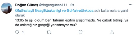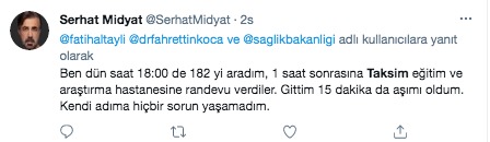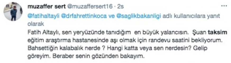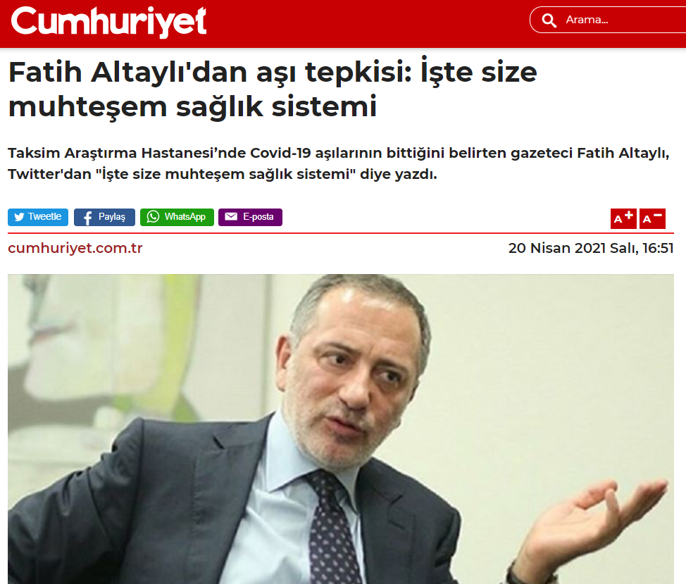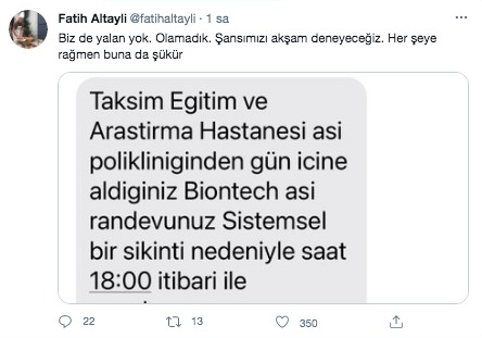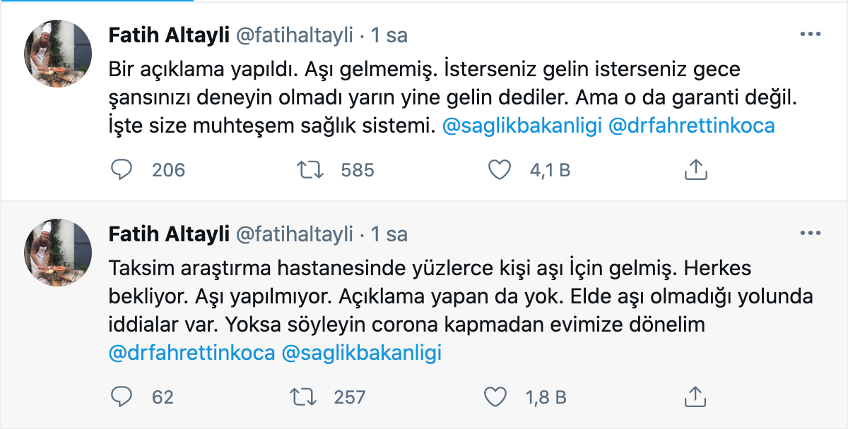 Habertürk Genel Yayın Yönetmeni Fatih Altaylı, Taksim Eğitim ve Araştırma Hastanesi'nde aşı sırasında olduğunu söyleyerek, twitter hesabından paylaşımda bulundu. Altaylı, "Taksim araştırma hastanesinde yüzlerce kişi aşı için gelmiş. Herkes bekliyor. Aşı yapılmıyor. Açıklama yapan da yok. Elde aşı olmadığı yolunda iddialar var. Yoksa söyleyin corona kapmadan evimize dönelim." dedi. Ardından bir paylaşımda daha bulunan Altaylı, "Bir açıklama yapıldı. Aşı gelmemiş. İsterseniz gelin isterseniz gece şansınızı deneyin olmadı yarın yine gelin dediler. Ama o da garanti değil. İşte size muhteşem sağlık sistemi." ifadelerini kullandı.