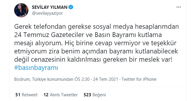 Altaylı'nın çirkin girişimine karşı tek kelime edemeyen Sevilay Yılman, twitter hesabından 24 Temmuz Gazeteciler ve Basın Bayramı'na ilişkin bir paylaşımda bulundu. 'Basın özgürlüğü' üzerinden üstü kapalı şekilde AK Parti iktidarını hedef alan Yılman, "Gerek telefondan gerekse sosyal medya hesaplarımdan 24 Temmuz Gazeteciler ve Basın Bayramı kutlama mesajı alıyorum. Hiç birine cevap vermiyor ve teşekkür etmiyorum zira benim açımdan bayramı kutlanabilecek değil cenazesinin kaldırılması gereken bir meslek var!" dedi.