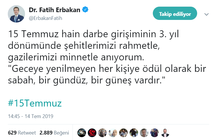 Sosyal medya hesabından paylaşımda bulunan Erbakan, "15 Temmuz hain darbe girişiminin 3. yıl dönümünde şehitlerimizi rahmetle, gazilerimizi minnetle anıyorum. 'Geceye yenilmeyen her kişiye ödül olarak bir sabah, bir gündüz, bir güneş vardır.' " ifadelerinde bulundu.