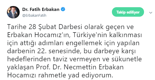 "Tarihe 28 Şubat Darbesi olarak geçen ve Erbakan Hocamız'ın, Türkiye'nin kalkınması için attığı adımları engellemek için yapılan darbenin 22. senesinde, bu darbeye karşı hedeflerinden taviz vermeyen ve sükunetle yaklaşan Prof. Dr. Necmettin Erbakan Hocamızı rahmetle yad ediyorum."