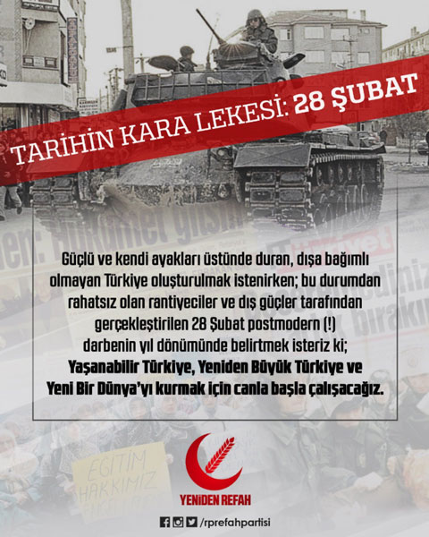 Yeniden Refah Partisi Genel Başkanı Fatih Erbakan, Twitter hesabından 28 Şubat darbesine dair mesaj yayımladı. Erbakan mesajında şu ifadeleri kullandı: