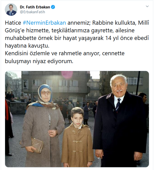 Yeniden Refah Partisi Genel Başkanı Fatih Erbakan da, annesini özlemle andı. Sosyal medya hesabından bir paylaşım yapan Erbkan, "Hatice Nermin Erbakan annemiz; Rabbine kullukta, Millî Görüş'e hizmette, teşkilâtlarımıza gayrette, ailesine muhabbette örnek bir hayat yaşayarak 14 yıl önce ebedî hayatına kavuştu. Kendisini özlemle ve rahmetle anıyor, cennette buluşmayı niyaz ediyorum." ifadelerini kullandı. İşte Fatih Erbakan'ın mesajı: