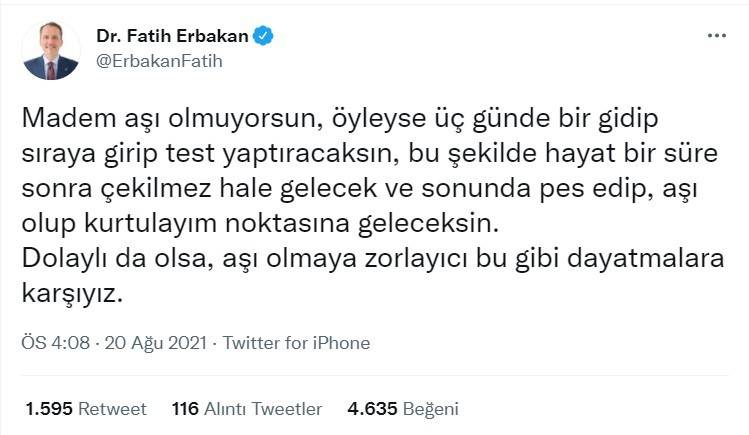 Aşı olmayanlara yönelik başlatılan PCR testi zorunluluğu uygulamasına Yeniden Refah Partisi Genel Başkanı Fatih Erbakan'dan tepki geldi.