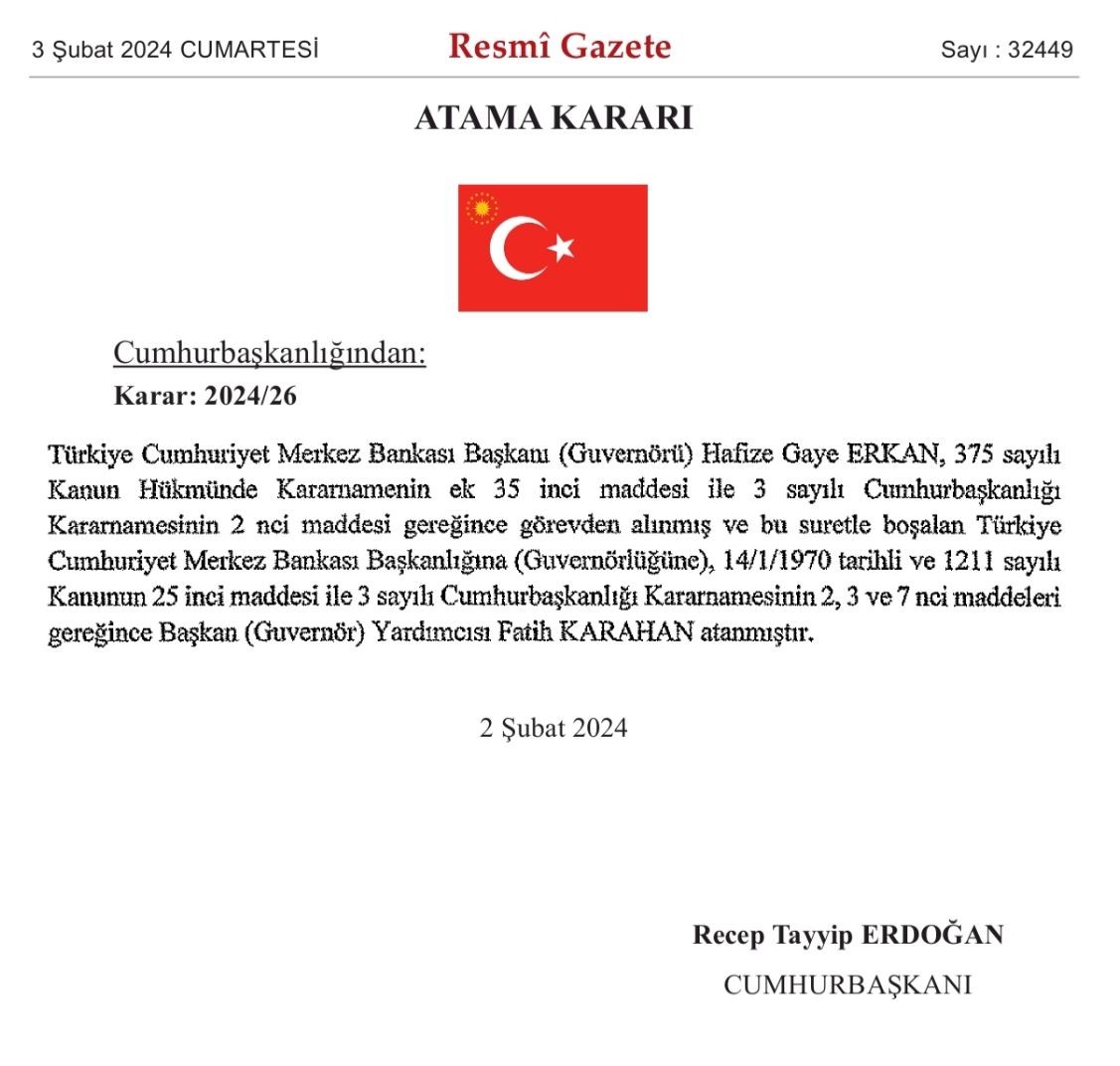 Resmi Gazete'de yayımlanan son dakika kararına göre, Hafize Gaye Erkan'ın istifası sonrası Merkez Bankası Başkanlığı görevine, Başkan Yardımcısı Fatih Karahan atandı.