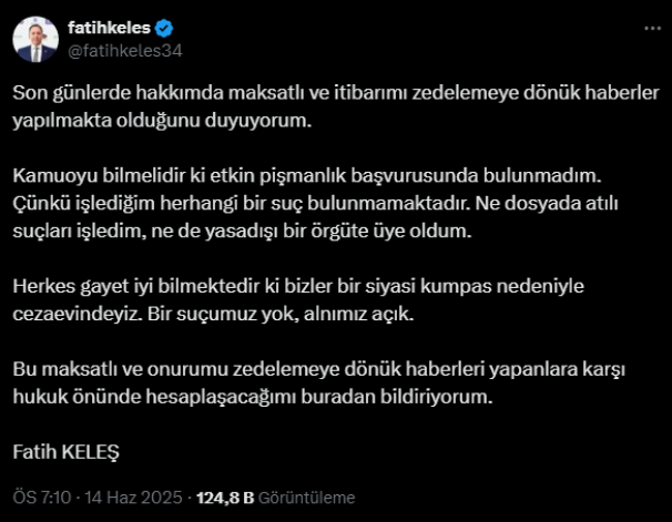 “Son günlerde hakkımda maksatlı ve itibarımı zedelemeye dönük haberler yapılmakta olduğunu duyuyorum. Kamuoyu bilmelidir ki etkin pişmanlık başvurusunda bulunmadım. Çünkü işlediğim herhangi bir suç bulunmamaktadır. Ne dosyada atılı suçları işledim, ne de yasadışı bir örgüte üye oldum.
