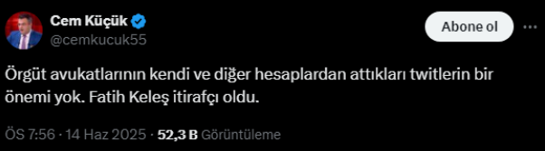 Cem Küçük, Keleş’in hesabından yapılan açıklama sonrası bir paylaşım yaptı. Küçük, “Örgüt avukatlarının kendi ve diğer hesaplardan attıkları twitlerin bir önemi yok. Fatih Keleş itirafçı oldu.” dedi.