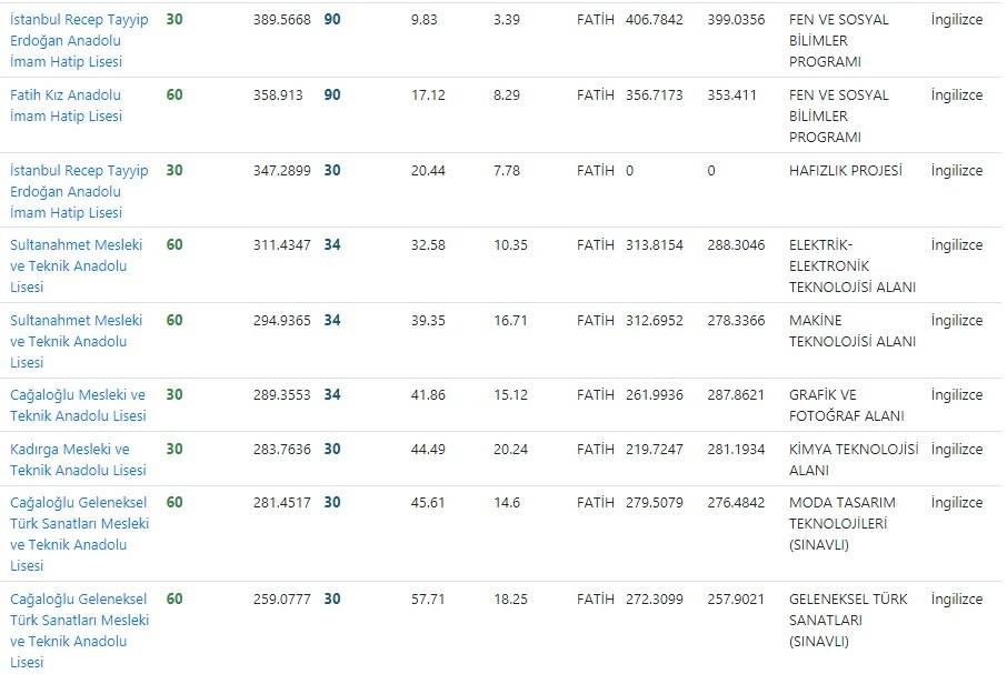 Fatih lise puanları yüzdelik dilimleri kontenjanları