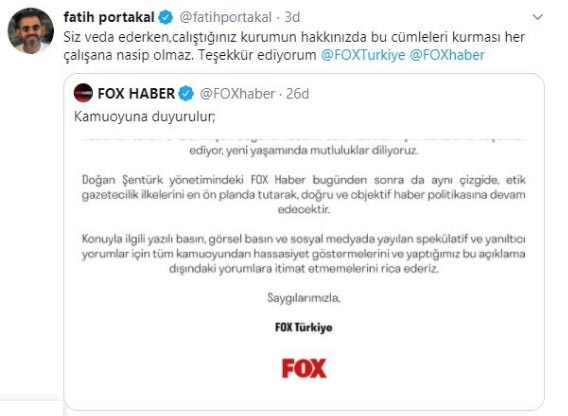 Türk toplumun ahlakını bozan yapımları dizi, film, yarışma adı altında yutturmaya çalışan Yahudi sermayeli FOX TV’den yapılan açıklamada Fatih Portakal, görevini bırakma kararı aldığını ve emekli olma isteğini yönetime bildirdiği açıklanırken Fatih Portal ise FOX’dan ayrılma sebebini ailevi nedenler başta olmak üzere sağlık, dinginlik olduğu dile getirdi. Fatih Portakal ayrılma tercihinin kendisinin verdiğini de vurguladı.