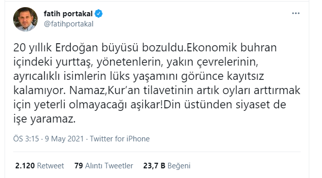 Eski Fox Tv sunucusu Fatih Portakal, CHP Genel Başkanı Kemal Kılıçdaroğlu önderliğindeki 128 milyar dolar yalanına destek vererek AK Parti iktidarını hedef aldı. Kendince '20 yıllık Erdoğan büyüsü bozuldu' yorumu yapan Portakal, iktidarı hedef almak için pek de ilgisinin olmadığı anlaşılan Müslümanların dini hassasiyetlerini ağzına doladı: