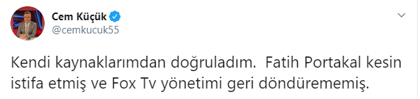 Konuyla ilgili olarak bir tweet atan gazeteci Cem Küçük, "Kendi kaynaklarımdan doğruladım. Fatih Portakal kesin istifa etmiş ve Fox Tv yönetimi geri döndürememiş." dedi.