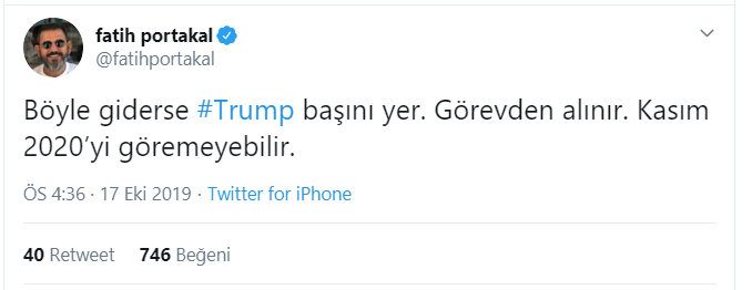 ABD menşeli Fox Tv'nin ana haber sunucusu Fatih Portakal, Trump'ın skandal tavırlarını Twitter hesabından eleştirdi. Portakal, "Böyle giderse Trump başını yer. Görevden alınır. Kasım 2020’yi göremeyebilir." diye yazdı.