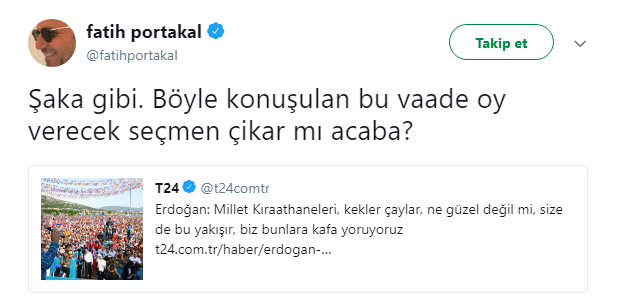 Cumhurbaşkanı Erdoğan'ın 'Millet Kıraathaneleri, kekler çaylar, ne güzel değil mi, size de bu yakışır, biz bunlara kafa yoruyoruz' sözlerini sosyal medya hesabından paylaşan Fatih Portakal altına şu notu düştü: "Şaka gibi. Böyle konuşulan bu vaade oy verecek seçmen çikar mı acaba?"