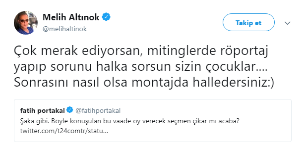 Altınok, Portakal'a "Çok merak ediyorsan, mitinglerde röportaj yapıp sorunu halka sorsun sizin çocuklar.... Sonrasını nasıl olsa montajda halledersiniz." cevabını verdi.