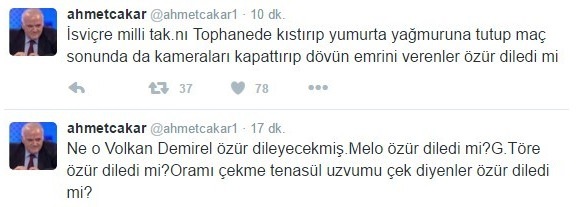 Sosyal medya hesabından paylaşımda bulunan Çakar, "Ne o Volkan Demirel özür dileyecekmiş. Melo özür diledi mi? Gökhan Töre özür diledi mi? Oramı çekme tenasül uzvumu çek diyenler özür diledi mi? İsviçre Milli Takımı'nı Tophane'de kıstırıp yumurta yağmuruna tutup maç sonunda da kameraları kapattırıp dövün emrini verenler özür diledi mi?" dedi.