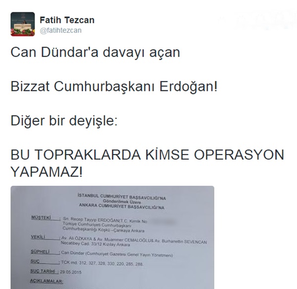 YENİAKİT.COM.TR - Fetullahçı Terör Örgütü’nden (FETÖ) gelen montaj belgeleri gazetesinde yayınlayan ve Türkiye aleyhinde yaptığı haberlerle akıllara kazınan Cumhuriyet'in Genel Yayın Yönetmeni Can Dündar teröre yardım ve casusluk suçlarından tutuklandı. Bunun üzerine Fatih Tezcan, Twitter'dan, "Can Dündar'a davayı açan bizzat Cumhurbaşkanı Erdoğan! Diğer bir deyişle: Bu topraklarda kimse operasyon yapamaz!" ifadelerini kullandı.