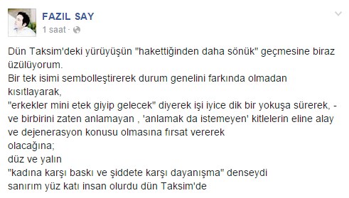 İslam'a ve Müslümanlara ettiği ağır hakaretlerle hafızalara kazınan piyanist Fazıl Say, Taksim'de dün Özgecan Aslan'ın katledilişini protesto etmek için yapılan 'Kadınlar için mini etekle yürüyoruz' eylemiyle ilgili eleştiride bulundu. Say, sosyal medyadan yaptığı açıklamada, "Taksim'deki yürüyüşün 'hakettiğinden daha sönük' geçmesine biraz üzülüyorum" dedi. Eylemin sadece 'erkekler mini etek giyecek' diye duyurulduğunu ve genele hitap etmeyi başaramadığını söyleyen Say, "Erkekler mini etek giyip gelecek" denilerek, işin iyice dik bir yokuşa sürüldüğünü, bu şekilde alay konusu olunmasına fırsat verildiğini savundu.