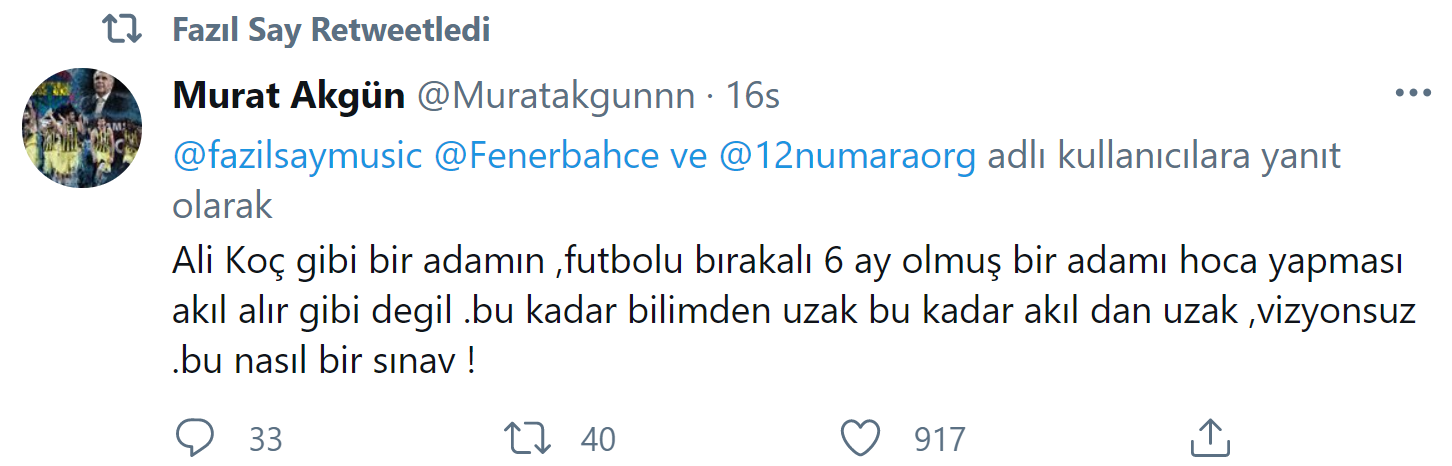 Karşılaşma sonrası sosyal medya hesabından açıklama yapan Fazıl Say, isim vermeden Ali Koç'a yükelndi. Maçın sonucuna tepki gösteren Say, "Kaç milyon Fenerbahçeliyiz dostlar? Kaç yıllık çile bbu siz söyleyin? Ruhsuzluk, vizyonsuzluk inançsızlık ve hatta yeteneksizlik! Ne bu? Ve bu çile niye seyredilsin ki?" ifadelerini kullandı. Say'ın "Ali Koç gibi bir adamın ,futbolu bırakalı 6 ay olmuş bir adamı hoca yapması akıl alır gibi degil .bu kadar bilimden uzak bu kadar akıl dan uzak ,vizyonsuz .bu nasıl bir sınav!" şeklindeki bir paylaşımı da retweetlediği dikkat çekti.