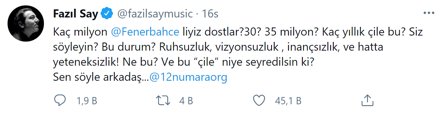 Fazıl Say, Fenerbahçe'nin deplasmanda Malatyaspor ile 1-2 berabere kaldığı karşılaşma sonrası isim vermeden Ali Koç'a ve takıma yüklendi.