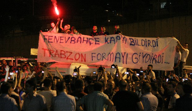 Karşılama töreninin en çok konuşulan anı bordo-mavili taraftarların, 'Fenerbahçe KAP'a bildirdi, Trabzon formayı giydirdi' yazılı pankartla ezeli rakip taraftarlarını sinirlendirecek bir gönderme yapması oldu.