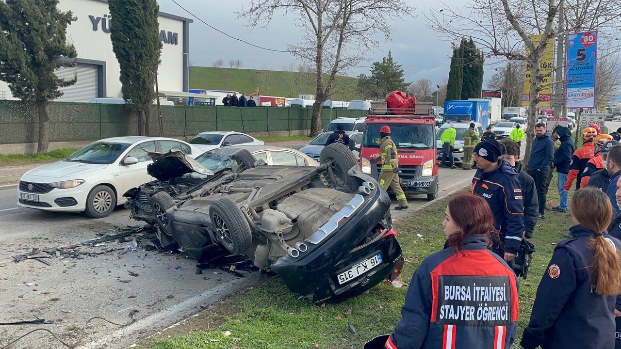 Bursa’da kontrolden çıkan otomobil karşı şeride geçerek başka bir araçla kafa kafaya çarpıştı. Kazada takla atan aracın şoförü sıkışırken, diğer araçtaki iki kişi yaralandı. Kaza anı bir işyerinin güvenlik kamerasına saniye saniye yansıdı.