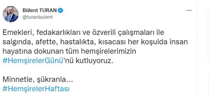 Resmi sosyal medya hesabından paylaşımda bulunan AK Parti Grup Başkanvekili Bülent Turan, “Emekleri, fedakarlıkları ve özverili çalışmaları ile salgında, afette, hastalıkta, kısacası her koşulda insan hayatına dokunan tüm hemşirelerimizin #HemşirelerGünü'nü kutluyoruz. Minnetle, şükranla...#HemşirelerHaftası” dedi.