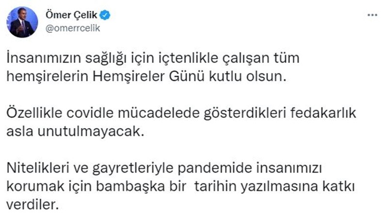 AK Parti Genel Başkan Yardımcısı Ömer Çelik, resmi sosyal medya hesabından yaptığı paylaşımda, “İnsanımızın sağlığı için içtenlikle çalışan tüm hemşirelerin Hemşireler Günü kutlu olsun. Özellikle covidle mücadelede gösterdikleri fedakarlık asla unutulmayacak. Nitelikleri ve gayretleriyle pandemide insanımızı korumak için bambaşka bir tarihin yazılmasına katkı verdiler” ifadelerini kullandı.