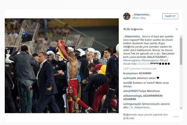 Felipe Melo resmi instagram hesabından yaptığı paylaşımda "Ne kadar uzakta olsam da kalbim, dualarım sizinle. Kupa aldığımız yerde yine, yeniden sizden bir zafer daha bekliyorum. Sonuç ne olursa olsun gerçekleri tarih yazar, tarihi de Galatasaray" ifadelerini kullandı.