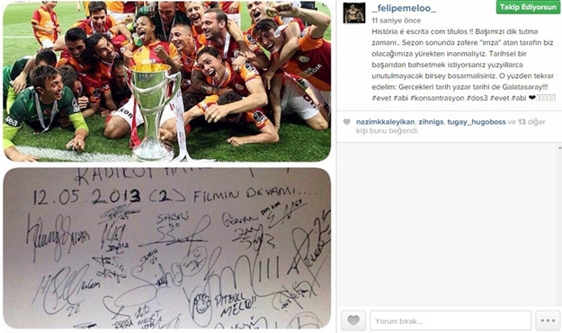 Tecrübeli orta saha; Kadıköy'deki şampiyonluktan fotoğrafı ile yaptığı paylaşımda; "Başımızı dik tutma zamanı. Sezon sonunda zafere "imza" atan tarafın biz olacağımıza yürekten inanmalıyız. Tarihsel bir başarıdan bahsetmek istiyorsanız yuzyillarca unutulmayacak birsey basarmalisiniz. O yuzden tekrar edelim: Gercekleri tarih yazar tarihi de Galatasaray!!!" ifadelerini kullandı.