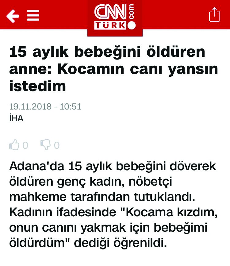 • Adana’da 15 aylık bebeğini döverek öldüren Aysel Y. mahkemede “kocamın canı yansın istedim” dedi. (2018)