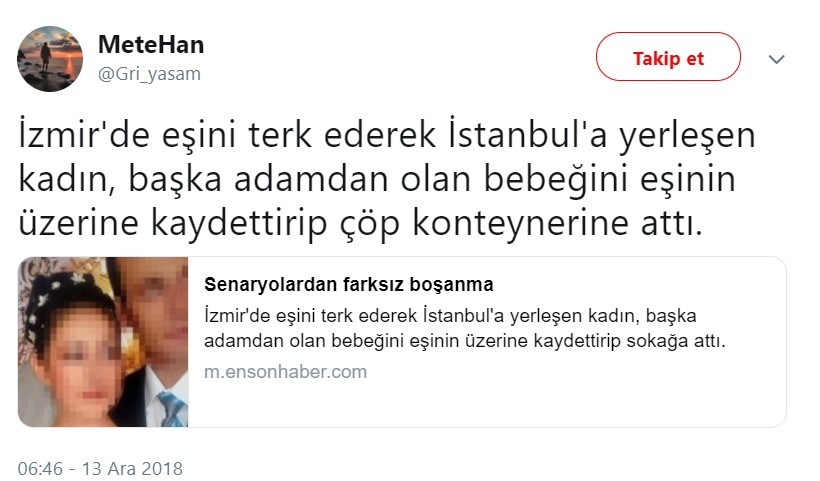 • İzmir’de eşini terk ederek İstanbul’a yerleşen A.S., başka adamdan olan bebeğini eşinin üzerine kaydettirip çöp konteynerine attı. (2018)