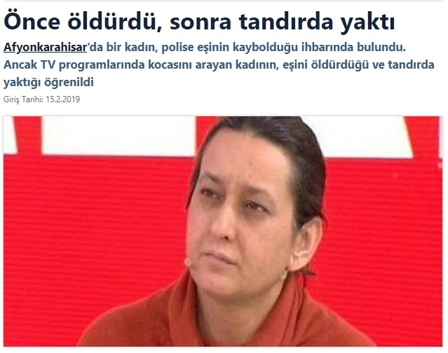 • Afyonkarahisar’da Kıymet Albayrak isimli kadın, polise eşinin kaybolduğu ihbarında bulundu. Ancak TV programlarında kocasını arayan kadının, eşini öldürdüğü ve tandırda yaktığı öğrenildi. (2019)