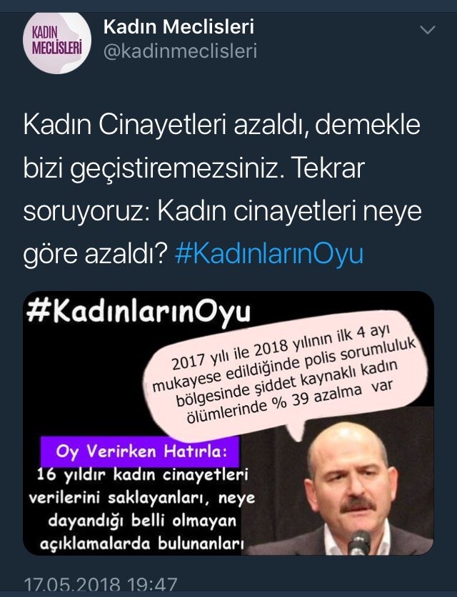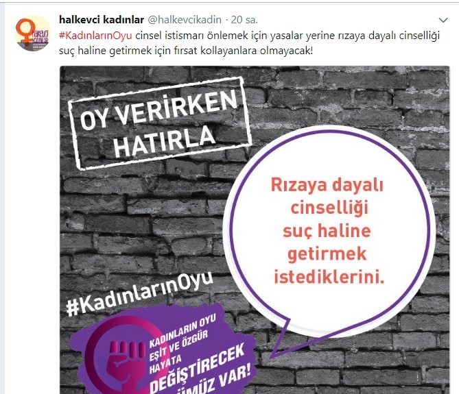 kaynaklı kadın ölümleri oranlarında azalış olduğuna dair açıklamasını eleştirerek, “Kadın cinayetleri azaldı demekle bizi geçiştiremezsiniz. Tekrar soruyoruz: Kadın cinayetleri neye göre azaldı? #KadınlarınOyu” paylaşımı yaptı. Bir diğer paylaşımda ise genel yayın yönetmeni FETÖ firarisi olan Cumhuriyet gazetesinin kupürü ile birlikte şu sözler kullanıldı: “#KadınlarınOyu erkekten yana siyasete değil; kendi mücadelesini tanıyanlara ve haklarını almalarına engel olmayanlara!”