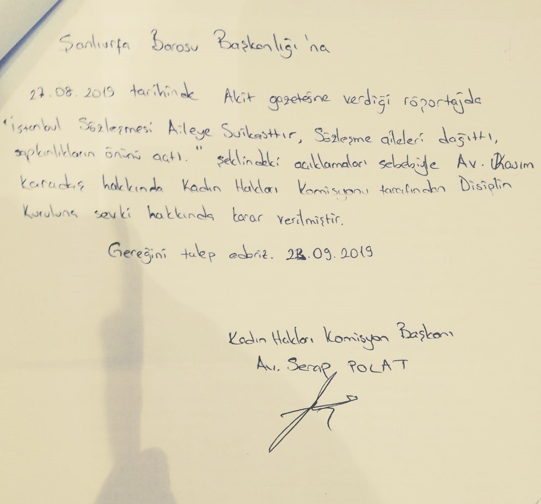 röportajda, ‘İstanbul Sözleşmesi aileye suikasttır, Sözleşme aileleri dağıttı, ayrılıkların önünü açtı’ şeklindeki açıklamaları sebebiyle Av. Kasım Karadaş hakkında Kadın Hakları Komisyonu tarafından Disiplin Kurulu’na sevki hakkında karar verilmiştir. Gereğini talep ederiz” ifadeleri yer aldı.