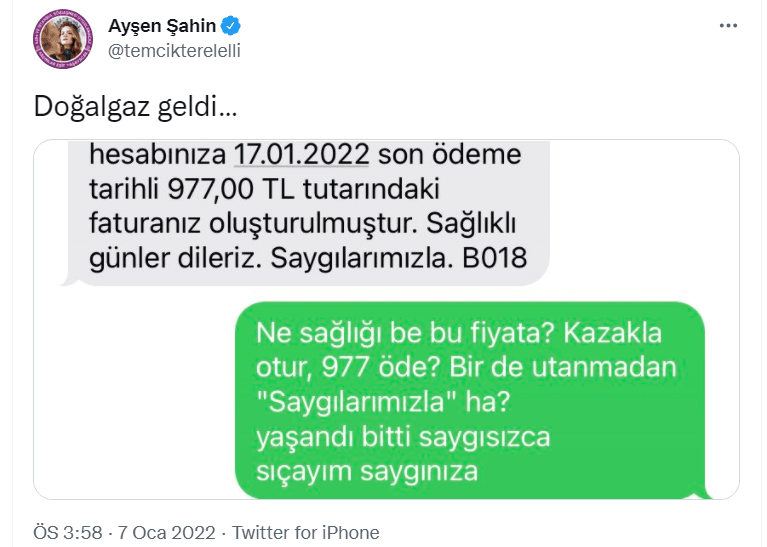 Skandallarla sıkça gündeme gelen Evrensel yazarı Ayşen Şahin, son olarak attığı iğrenç tweet’le hem cahilliğini ve hem de küfürbaz olduğunu bir kez daha gösterdi. Kendisine doğalgaz faturasına ilişkin otomatik sistemle gönderilen mesaja karşılık veren Şahin, “Ne sağlığı be bu fiyata? Kazakla otur, 977 öde? Bir de utanmadan “Saygılarımızla” ha? yaşandı bitti saygısızca sıçayım saygınıza” dedi.