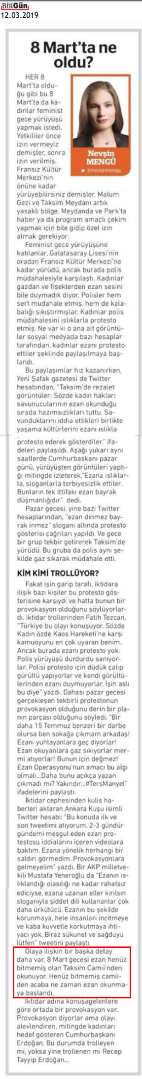 BirGün’ün sahip çıkarak köşe karalamasına müsade ettiği ‘sol kırması’ Nevşin Mengü, yine rezil oldu. 8 Mart gecesi feministlerin ıslıkladığı ezanın Taksim Camii’nden okunduğunu zanneden Mengü, yazının ilgili bölümünü internet sitesinden sildirdi. Ne var ki, gazete baskısında yazının mezkûr bölümü yayınlandı.