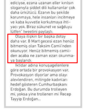 “Olaya ilişkin bir başka detay daha var. 8 Mart gecesi ezan henüz bitmemiş olan Taksim Camii’nden okunuyor. Henüz bitmemiş camiiden acaba ne zaman ezan okunmaya başlandı.”