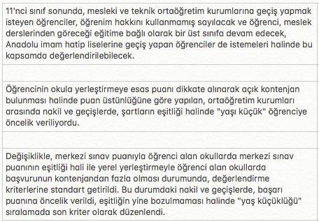 Ortaöğretim kurumları arasında nakil ve geçişler yeniden düzenlendi. Buna göre, fen liseleri, sosyal bilimler liseleri, proje okulu olan Anadolu liseleri ile Anadolu liselerinin birbirleri arasında, her sınıf seviyesinde geçiş yapılabilecek. Merkezi sınav puanıyla öğrenci alan ortaöğretim kurumları arasında taban puan ve boş kontenjan şartına bağlı olarak, yerel yerleştirmeyle öğrenci alan ortaöğretim kurumları arasında ise boş kontenjan ve başarı puanı üstünlüğüne göre 12. sınıfa kadar nakil veya geçiş olabilecek.