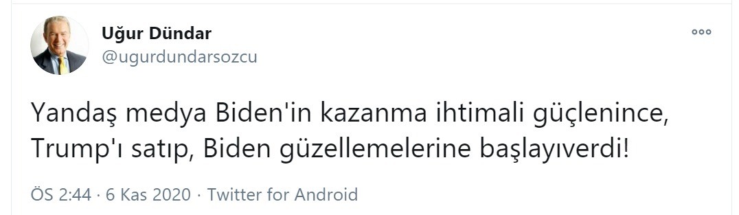 Dündar Twitter hesabından yaptığı paylaşım ile ‘yandaş’ diye tabir ettiği yerli ve milli medyanın Biden’ın kazanma ihtimali artınca Trump’ı satıp Biden güzellemesi yaptığını iddia etti.
