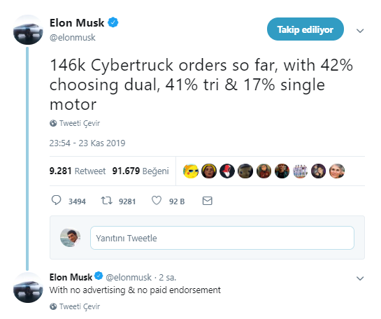 Elektrikli otomobil şirketi Tesla şirketinin CEO’su Elon Musk, Twitter hesabından "Cybertruck"ın satış rakamlarına ilişkin bilgi verdi. Musk, şu ana kadar Cybertruck için 146 bin sipariş aldıklarını duyurdu. Ayrıca Musk, bu satışı reklamsız ve sıfır ciro ile yapıldığını belirtti.