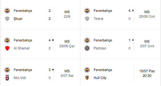 Fenerbahçe, hazırlık maçlarına devam ediyor. İlk hazırlık maçını Şkupi ile yapan Fenerbahçe, ikinci maçını Tirana, üçüncü hazırlık maçını Al Shamal ile yaptı. Sırbistan ekibi FK Partizan ile karşı karşıya gelen Fenerbahçe, mücadeleden 1-0 galip ayrıldı. Mol Fehervar ile de hazırlık maçına çıkan sarı lacivertli ekip Mol Fehervar'ı 3-0 mağlup etti. Fenerbahçe, Acun Ilıcanı’Nın sahibi olduğu Hull City ile hazırlık maçına çıkacak.