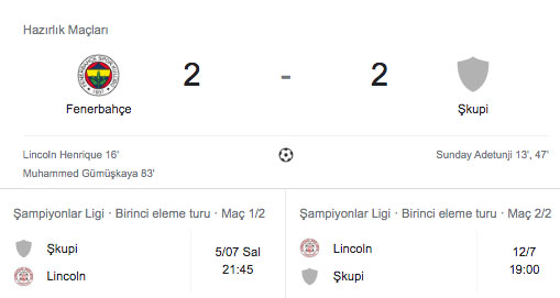 Süper Lig’i ikinci sırada tamamlayan Fenerbahçe, yeni sezona hazırlık kapsamında ilk hazırlık maçına çıktı. Bu bağlamda Kuzey Makedonya'yı Şampiyonlar Ligi'nde temsil edecek olan Shkupi hazırlık maçı sonucu futbolseverler tarafından merak ediliyor. Peki Fenerbahçe Shkupi hazırlık maçı kaç kaç? Fenerbahçe Shkupi maçı sonucu ne oldu? İşte Fenerbahçe Shkupi hazırlık maçı sonucu.