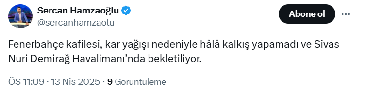 Sercan Hamzaoğlu’nun haberine göre, Fenerbahçe kafilesi, kar yağışı nedeniyle hâlâ kalkış yapamadı ve Sivas Nuri Demirağ Havalimanı’nda bekletiliyor.
